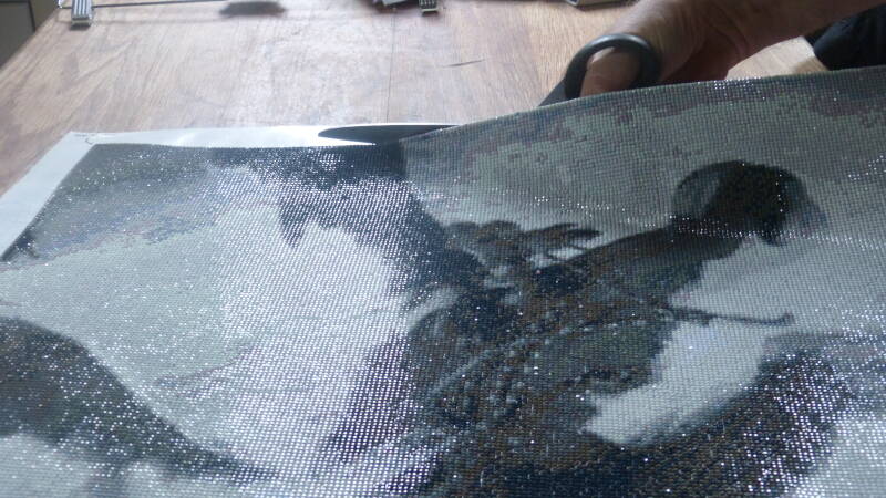 De painting zijn plaklaag werd beschermd met een folie dus zo kun je iedere keer een stukje losmaken. Wat mij wel opviel was dat er op het doek geen legenda was van welk steentje wat is. Daar moest ik even aan wennen maar dat was totaal niet erg want je had dat natuurlijk op papier. Wel vond ik het fijn dat de hele painting bedekt was met een folie zo blijft je arm tijdens het painten niet steeds plakken.
