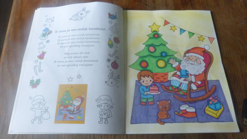 Wat mij als eerst opviel was dat kaft heel vrolijk gekleurd was , dat het boek niet aan 1 kant bedrukt is dat er op iedere linker pagina een mooi kerstliedje staat en aan de rechterkant juist een mooie kleurplaat. Ook zie ik dat er kleine afbeeldingen op iedere pagina staan waar je de stickers moet plakken, de stickers zitten in het midden van het boek. Het papier voelt goed aan en ook zeker geschikt voor materialen als stiften maar dat heb ik wel even getest.