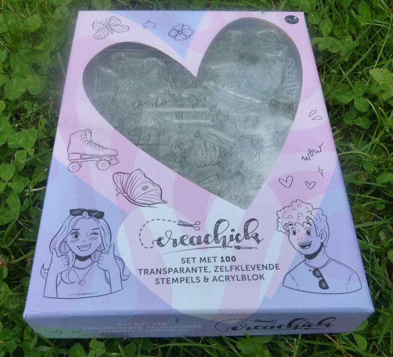 Wat mij meteen opvalt is het mooie doosje om de stempels. Op deze manier kun je alles mooi bij elkaar houden. De stempels bevatten leuke prentjes van meisjes en een jongen en in verschillende thema's. Er zit ook een mooi blokje in waar je de stempels op plakt.