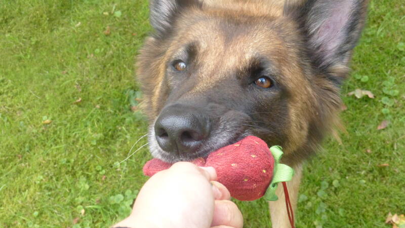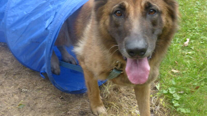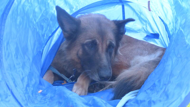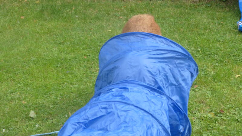 De basis comando`s kende ze dus al daar bedoel ik de zit en af bijvoorbeeld mee. Maar toch heb ik die even proberen te doen op de manier van het boek en dat ging erg goed! Daarna hebben we een stukje over voedselweigeren geoefend. Ik moet zeggen dit kende ze nog niet en ze is gek op eten. De oefening werd heel makkelijk uitgelegd en ze leerde het heel snel. De oefening vast en los was ook erg leuk om te doen, Xena is gek op knuffels dus die heb ik voor deze oefening gepakt zoals je op de foto kan zien zit ze heel verliefd naar haar aardbei te kijken. Toen ik het commando vast gaf pakte ze de knuffel en met los werd de knuffel meteen weer los gelaten. Ik vind dit wel hele belangrijke comando`s wat iedere hond eigenlijk wel moet kunnen. Na de basis oefeningen gedaan te hebben heb ik besloten een snuffel parcours uit te zetten zodat ze zelf lekker kon gaan snuffelen. Ook dit was een oefening duidelijk beschreven in het boek. Ik sluit deze review af met de tunnel oefening. En dit vond ze echt geweldig.(maar dat vond ze als pup al te gek)