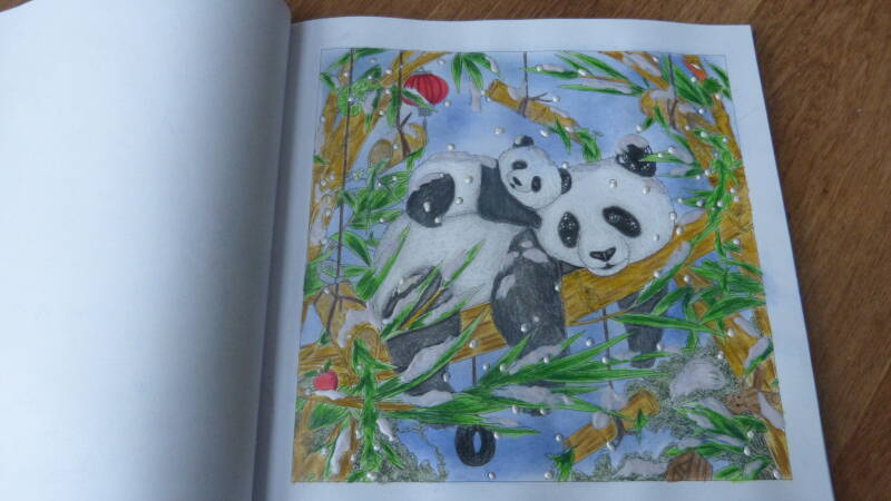 Voor de winter panda's kleurde ik de kleurplaat in met Faber Castell polychromos potloden en pearlpaint en wat pastelkrijt.