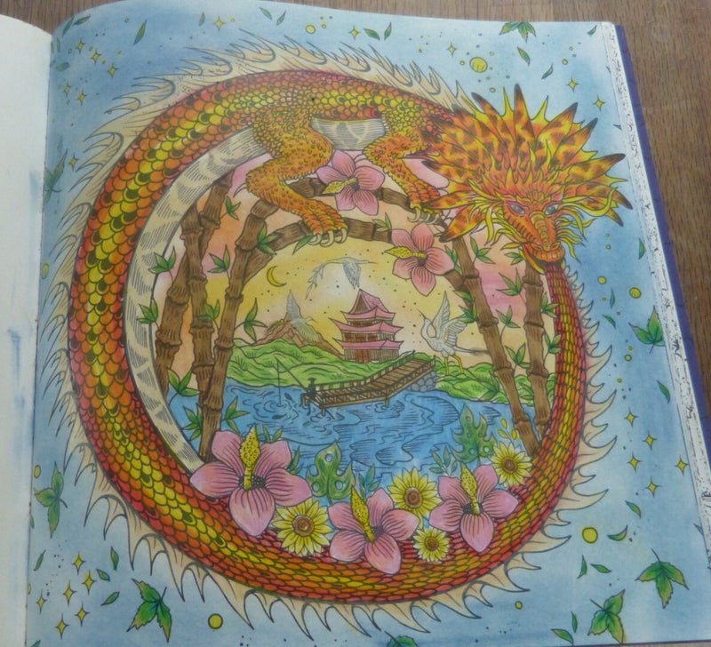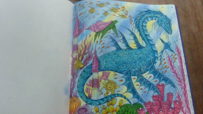 Als eerst kleurde ik de waterdraak in met veel laagjes, die bouwde ik op van licht naar donker de potloden gleden over het papier en het dekte ook volledig. Daarna ben ik de andere decoratie gaan kleuren, het papier is lekker glad en houd de kleuren zowel van de pastelkrijt als van het potlood goed vast.