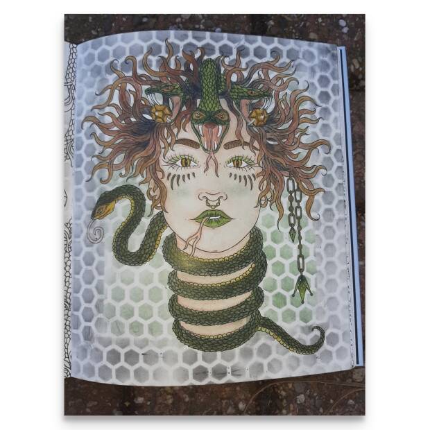 Als eerst kleur ik de dame en haar slangen in ik gebruik hier meerdere lagen voor en dat kan dit papier probleemloos hebben, geen witte puntjes dus ook geen blender nodig. De potloden glijden over het papier heen. Vervolgend pak ik een sjabloon en ga de hele achtergrond voorzien van een motief.