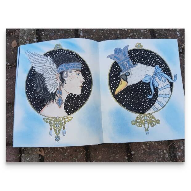 Ik begin om de achtergrond zwart te kleuren met posca, dat gaat heel goed en de posca drukt ook niet door. Vervolgens kleur ik het kader en de kroon in met Pitt artist stiften van Faber Castell, ook deze stiften drukken niet door. Vervolgens geef ik de zwaan en de dame kleur met de pastelpotloden. De potloden kleuren heel fijn op dit papier en ook het laten mensen van kleuren loopt gemakkelijk. Als laatste geef ik de achtergrond met pastelkrijt ook een kleurtje.