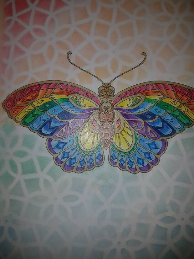 Ik begon met de tekst te lezen, hier werden een paar kenmerken van de vlinder verteld en natuurlijk hou ik daar dan rekening mee de vlinder had gouden randjes en die heb ik gezet met een gouden gelpen, daarna ben ik de rest gaan kleuren met potlood. De vlinder was ook erg kleurrijk en waar zit meer kleur in dan bij de regenboog dus werd mijn vlinder een regenboog vlinder. Je kon met de Bruynzeel design heel makkelijk in laagjes kleuren zonder al teveel druk te zetten dat was erg fijn. Als laatste maakte ik de achtergrond met pastelkrijt en dat lukte perfect, ik kon de kleuren makkelijk verspreiden in het slabloon.