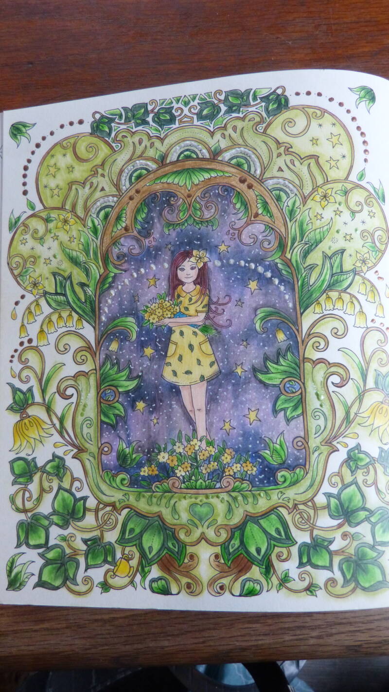 Ik begon met het meisje te kleuren voor de huid gebruikte ik 2 tinten en dat blende heel gemakkelijk in elkaar, Vervolgens kleurde ik alle andere dingen in met potlood en dat ging echt perfect, ik moet zeggen ik vind dit het fijnste papier van al Johanna`s boeken. Voor de achtergrond gebruikte ik Faber Castell pastelkrijt, ook dit merk krijt hechte makkelijk aan het papier en gaf een mooie kleur.