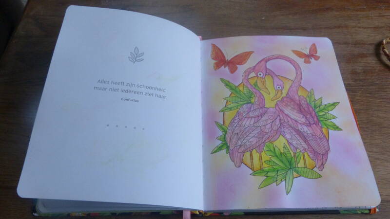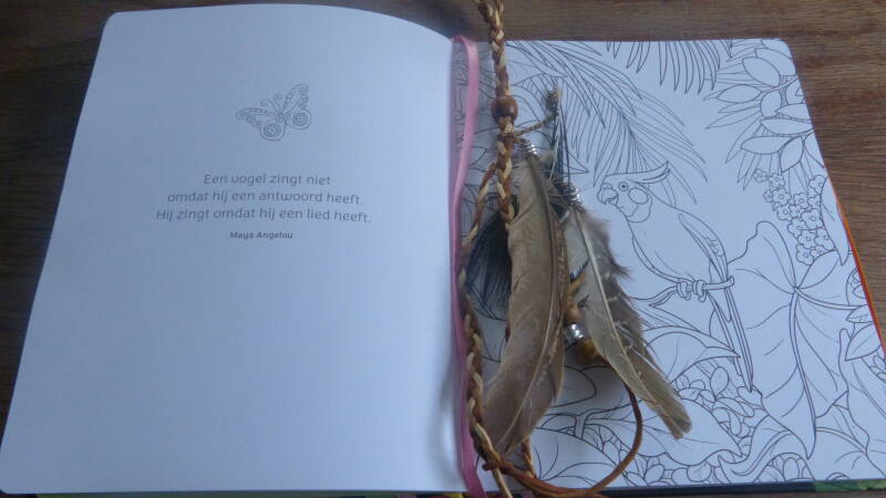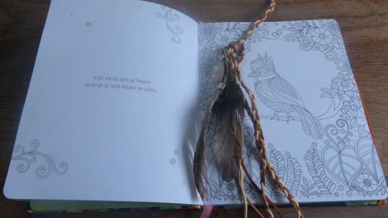 Wat mij als eerst opviel was het handige formaat van het boekje, dat het boek dicht gehouden word door een elastiek en dat er een bladwijzer in het boek gebonden is. Wat ik ook erg leuk vind is dat je links een leuke quote hebt en rechts een leuke kleurplaat. Op deze manier hoef je niet bang te zijn dat je materiaal door gaat drukken. Wat mij ook is opgevallen dat het boek een harde kaft heeft en dat vind ik erg mooi.