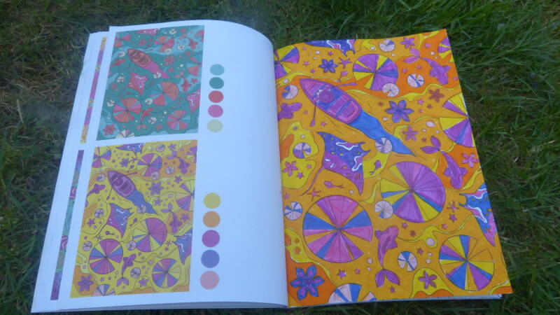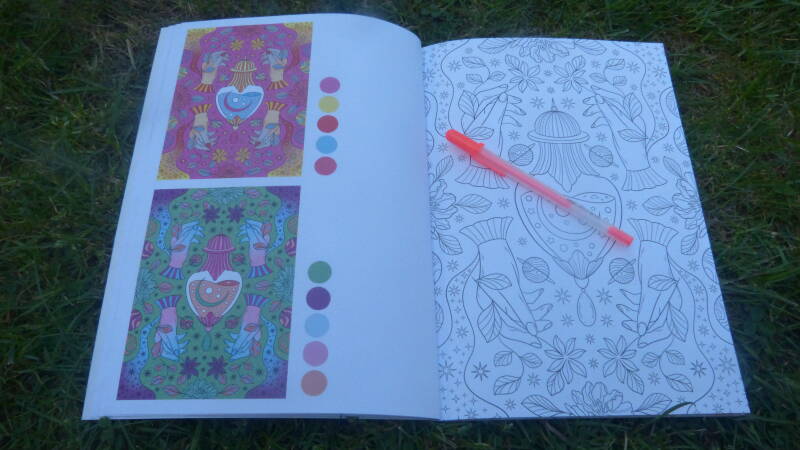 Deze stiften kleuren wel fijn op dit papier ze bloeden niet maar zorgen wel voor een lichte ghosting. Maar dat is totaal niet erg. Het papier laat het prima toe dat je in meerdere lagen kleurt. Deze plaat had 2 voorbeelden en je kreeg ook een kleuren pallet. En ik heb de onderste gevolg. Het was erg leuk om te doen.