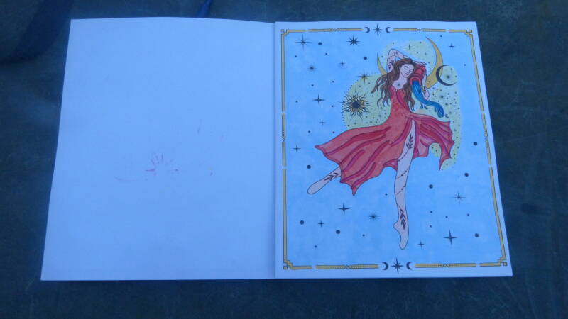 Wat me meteen aan het boek opviel was de zwarte kaft vol mooie illustraties passend bij het thema van het boek, ook voelde ik op de kaft al de glitters. Het boek is een formaat wat makkelijk mee te nemen is voor als je op vakantie gaat. Ik vond het een echt plus punt dat het boek aan 1 kant bedrukt is. Want zo ben je vrij in je materiaal keuze. Ook vond ik het mooi dat er op iedere plaat veel glittereffecten zijn. Dat geeft een plaat toch wat meer uitstraling.