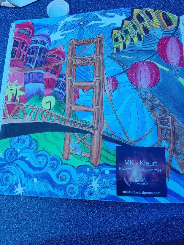 Toen ik naar de winkel ging om dit boek aan te schaffen wist ik niet precies wat ik moest verwachten want had de tekst van het boek nog niet gelezen, aan de titel magische stad denk ik aan elfjes en draken maar dat heeft dan weer niet veel te maken met een stad. Uit nieuwsgierigheid is dit boek toch in mijn mandje gevallen. Eenmaal thuis aangekomen meteen naar mijn kleurhoekje gegaan om te kijken wat het boek nu precies is. Inderdaad dit boek had niets met elfjes, trollen of draken in een stad te maken, in dit boek staan allemaal gebouwen op een artistieke manier(bijna magisch) getekend. Dat wekte wel ontzettend mijn nieuwsgierigheid. Wat me meteen opviel was dat de platen wel erg druk waren en je soms niet zult weten waar je moet beginnen, maar toen viel me iets op in de hoek van de kleurplaat. Bij elke plaat staat wat voor gebouw het is en waar dat gebouw zich bevind, op deze manier kun je als je inspiratieloos bent toch opzoeken hoe het originele gebouw eruit ziet. Dat heeft mij iniedergeval enorm geholpen. Wel vond ik alle platen een uitdaging en had ik er gewoon zin in om te beginnen, ook leek het papier me erg stevig.