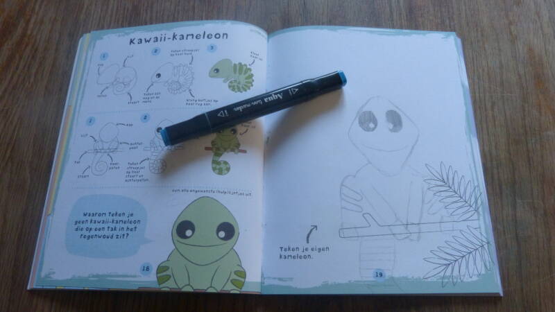 Wat mij meteen opviel aan het boek was het handige formaat maar dat niet alleen, ook de vrolijkheid wat de kaft uitstraalt. Verder viel me op dat er voor elk dier ook een pagina is waar je echt op kunt tekenen. Dat is heel fijn want op de linker pagina staat het stap voor stap uitgelegd, in verschillende houdingen. In het begin van het boek staat ook hoe je dieren er juist schattige uit kan laten zien door hel lieve schattige voetjes te tekenen of verschillende gezichtsuitdrukkingen.