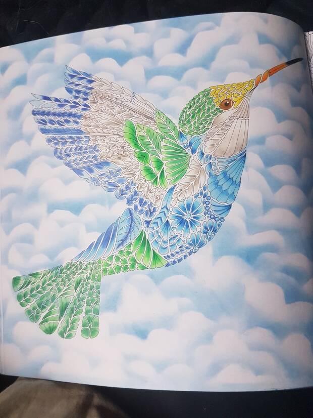 Ik begon met het kleuren van de Kolibrie ik begon met het zwarte gedeelte om dat ik daar lagen van maar 1 kleur ging aanbrengen en bij de rest in meerdere. Ik kan je zeggen dat de Bruynzeel potloden heel fijn kleurden op het papier, je kreeg geen witte puntjes of wat dan ook. Ik had geen blend potlood nodig. Voor de achtergrond heb ik een sjabloon gemaakt voor een wolkenachtergrond en ik moet zeggen dat het pastelkrijt zich heel makkelijk hechte aan het papier.