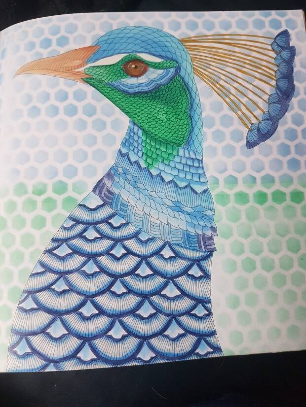 Voor de 2de plaat ging ik voor een pauw die ik kleurde met Faber Castell Polychromos en Polychromos krijt voor de techniek die ik hier heb gebruikt moest ik ook een blend potlood gebruiken om de kleuren uit te vegen zeg maar.