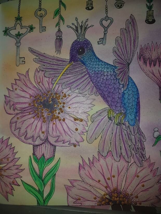 VOOR DE 3DE EN LAATSTE PLAAT KOOS IK DE KOLIBRIE EN DIE KLEURDE IK MET BRUYNZEEL DESIGN COLOUR EN DE ACHTERGROND MET DIVERSE SOORTEN PASTELKRIJT EN DETAILS MET PEARL PAINT VAN DE ACTION.