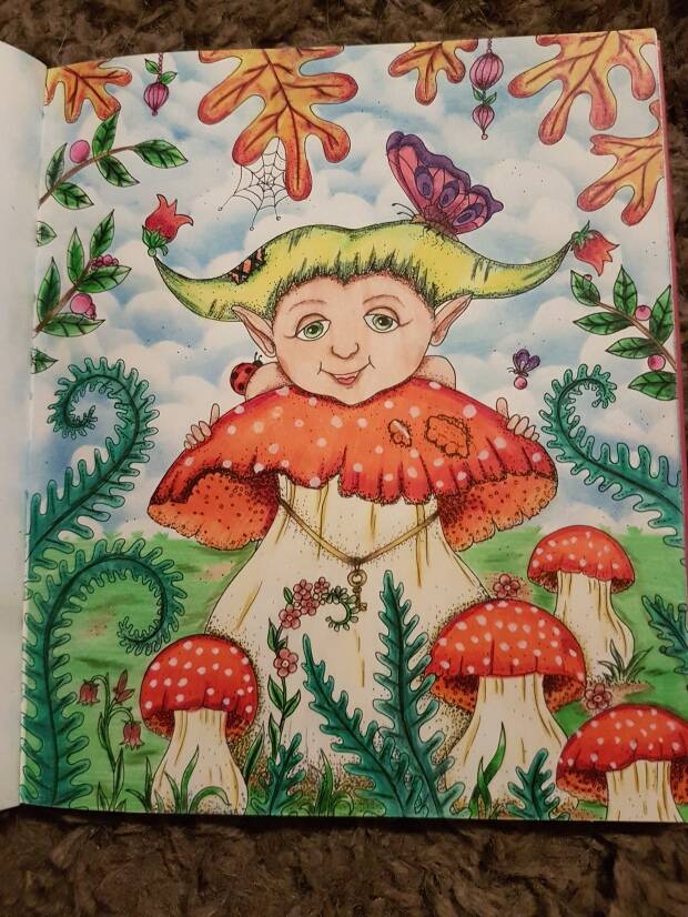 EEN LIEFLIJK KLEURBOEK MET DAARIN EEN HELEBOEL HANDGETEKENDE ILLUSTRATIES. DE TEKENINGEN ZIJN ENKELZIJDIG GEDRUKT, ZODAT JE MET NET ZOVEEL PLEZIER KLEURPOTLODEN ALS VILTSTIFTEN, FINELINERS OF VERF KUNT GEBRUIKEN. JE HOEFT NIET BANG TE ZIJN DAT JE EEN PLAAT OP DE ACHTERKANT VERPEST. OP DE ACHTERKANT VAN ELKE TEKENING STAAT EEN KLEIN HUISJE GETEKEND EN EEN PADDENSTOEL, WAAR JE BIJ KUNT SCHRIJVEN WANNEER, WAAR, WAARMEE EN DOOR WIE DE TEKENING GEKLEURD IS.