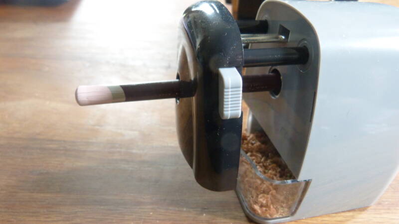 Wat mij meteen opviel aan deze puntenslijper is dat deze niet zoals mijn PSN puntenslijper een ring heeft om je potlood in te doen, maar deze puntenslijper heeft rubberen grijpertjes om je potlood niet te beschadigen. Ik vind dat persoonlijk een stuk fijner lijken. Ook kun je bij deze puntenslijper de scherpte van je punt instellen en zit er onderin de puntenslijper een bakje voor het slijpsel.