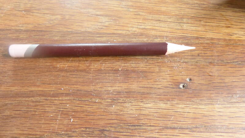 Om te beginnen pak ik een Derwent potlood met stompe punt om te kijken hoe deze puntenslijper slijpt. Ik stel achter op de puntenslijper de scherpte van de punt in en stop het potlood in het grijpertje. Vervolgens draai ik aan het hendeltje en slijpen maar. Tijdens het slijpen hoef ik het potlood niet vast te houden dat vind ik erg fijn... maar wat nog fijner is is dat ik tijdens het slijpen ineens voelde dat hij niet meer sleep. Ik haalde het potlood uit de puntenslijper en ja hoor daar was een mooie punt.