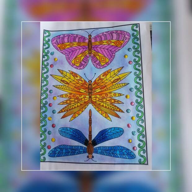 De potloden kleurden heel fijn op gewoon tekenpapier, zonder strepen of afzet strepen. Maar uiteraard heb ik in deze plaat meer kleurtechnieken gebruikt want ik wil jullie wel eerlijk kunnen zeggen wat ik er van vind. Ik kleurde de eerste vleugels van de blauwe vlinder vlakje voor vlakje en dat meerdere dunne lagen. Dat ging zonder problemen. Voor de tweede vleugel ging ik toch iets meer in laagjes kleuren. De lagen kun je makkelijk aanbrengen en je kreeg geen ongelijke stukken o.i.d. Ik heb 2,3 en 4 kleuren geblend met elkaar en dat ging zelfs op dit papier helemaal goed.