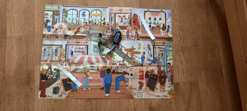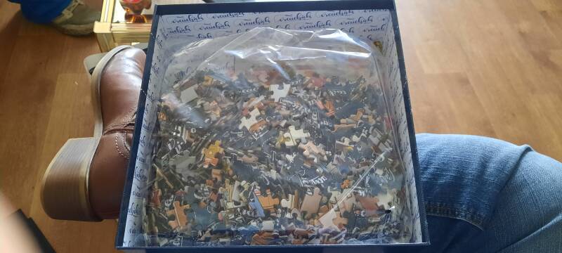 Om te beginnen maakte ik de zak met stukjes los en filterde de kantjes, hoekjes en middenstukjes. Toen ik dat gedaan heb ben ik lekker gaan puzzelen. Ik vond de stukjes er allemaal goed uitzien, geen vouwen of wat dan ook. Toen de randjes in elkaar zaten begon ik met het middenstuk en ik kan je vertellen de poster kwam goed uit. Zoveel stukjes wat op elkaar lijken en toch ook weer niet. Toen ik halverwege was maakte ik een foto.