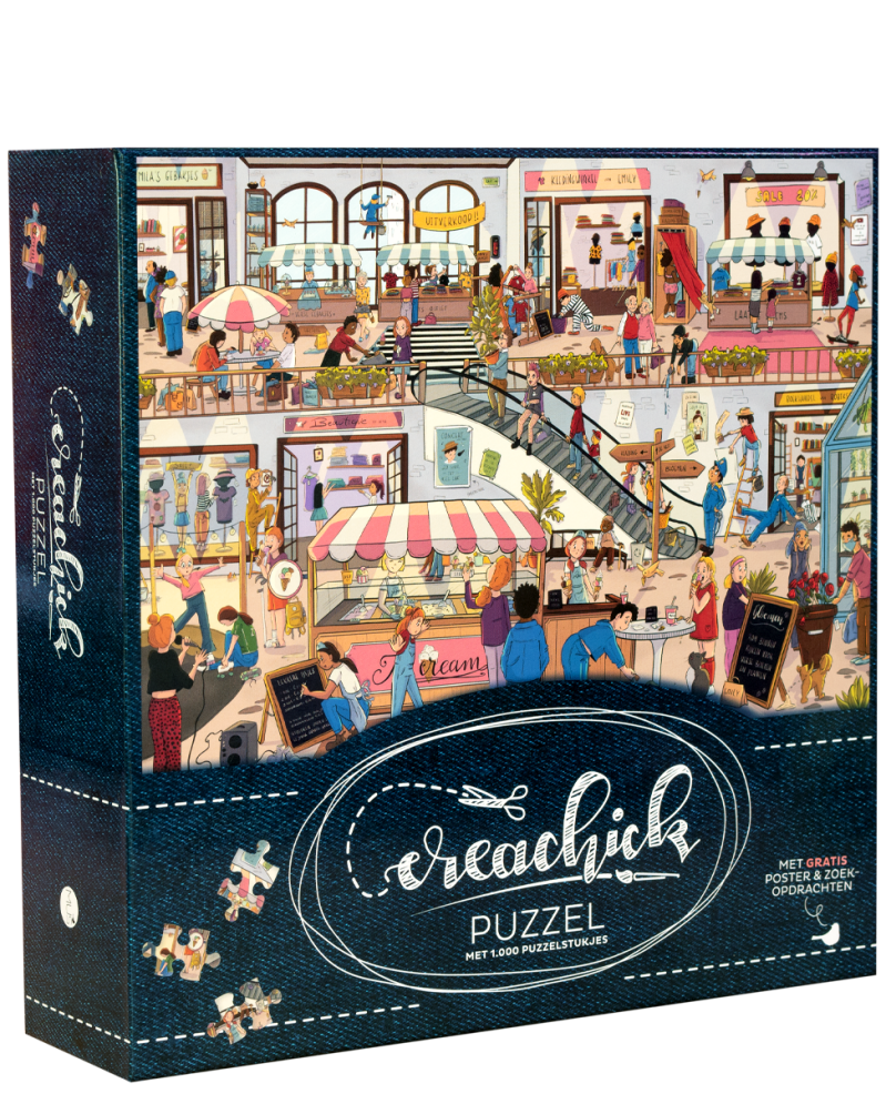 Je hoeft nu even niet zelf creatief bezig te zijn van onze creakoningin CreaChick. Dit keer neemt ze je aan de hand door het populairste vermaak van 2021: puzzelen. Samen met MUS maakte zij een door haar ontworpen en handgetekende puzzels van maar liefst 1000 stukjes! Er is in deze cartooneske plaat enorm veel te ontdekken, hij barst van de kleine details en elke keer spot je weer iets nieuws. Rolschaatsende kids, een vrouw die schrikt als haar paskamertje plots wordt opengetrokken, een kledingrek dat omvalt, mensen die uitglijden over gemorste milkshake, er gaat van alles mis in dit overvolle winkelcentrum. In de doos vind je een poster op ware grootte en extra zoekopdrachten om bepaalde objecten op te speuren, voor een extra interactief tintje en urenlang puzzelplezier!
